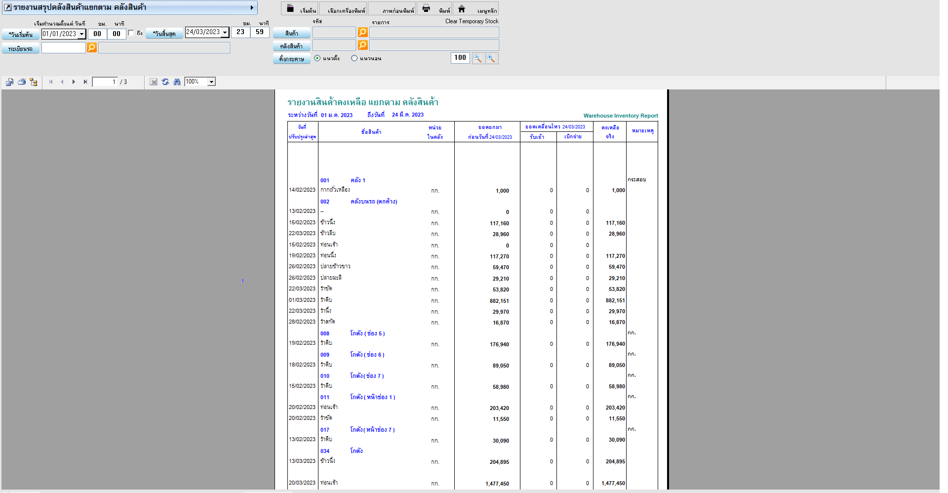 รายงานสินค้าคงเหลือแยกตามคลังสินค้า