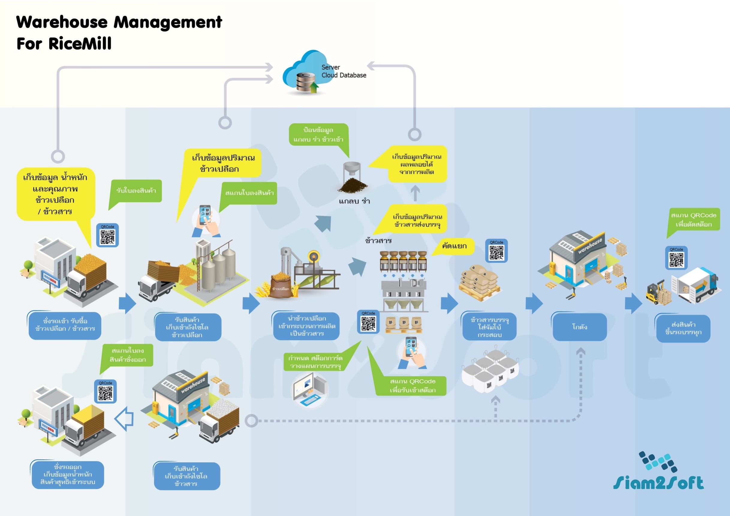 การคำนวณการสีข้าว คำนวณ เปอร์เซ็นต์การสี แยกตามชนิดข้าว และตัดสต๊อกอัตโนมัติ |