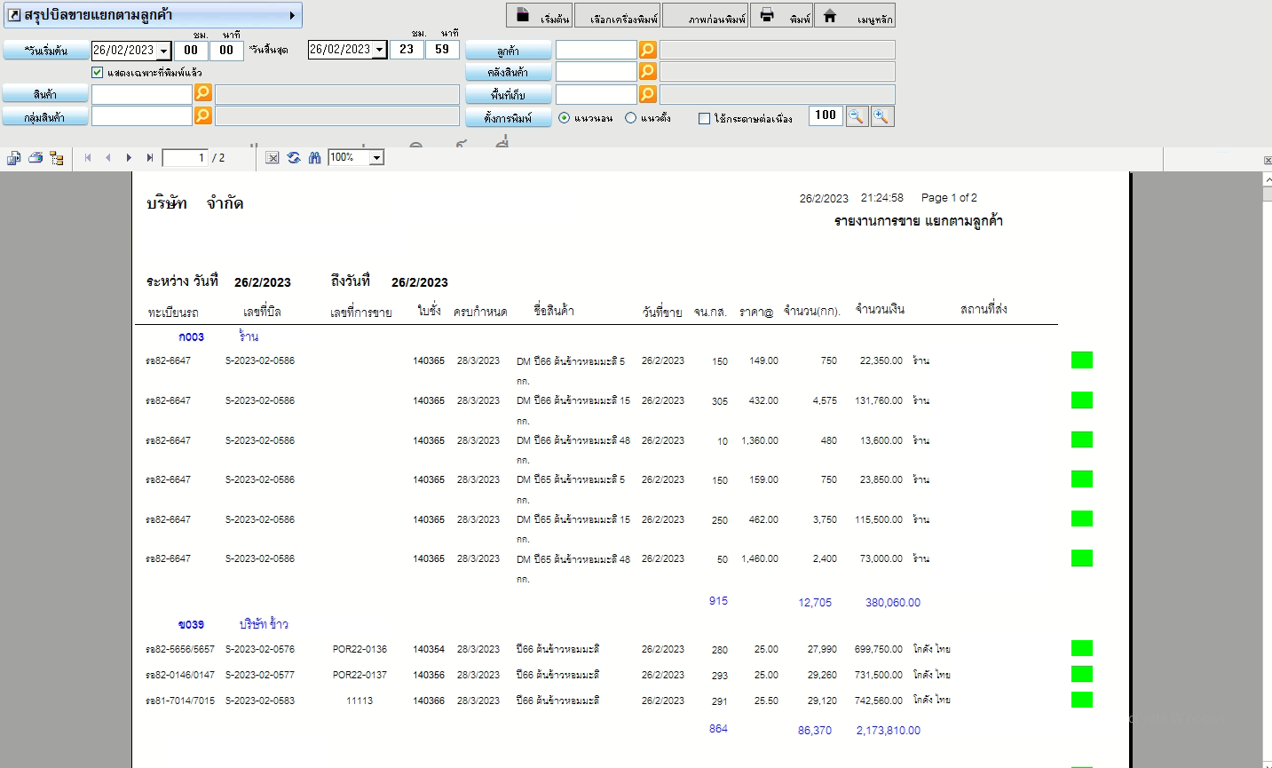 ตัวอย่างรูปแบบรายงานการขาย สามารถเลือกกรองข้อมูลแยกตาม วันที่ ลูกค้า สินค้า กลุ่มสินค้า ได้ตามต้องการ