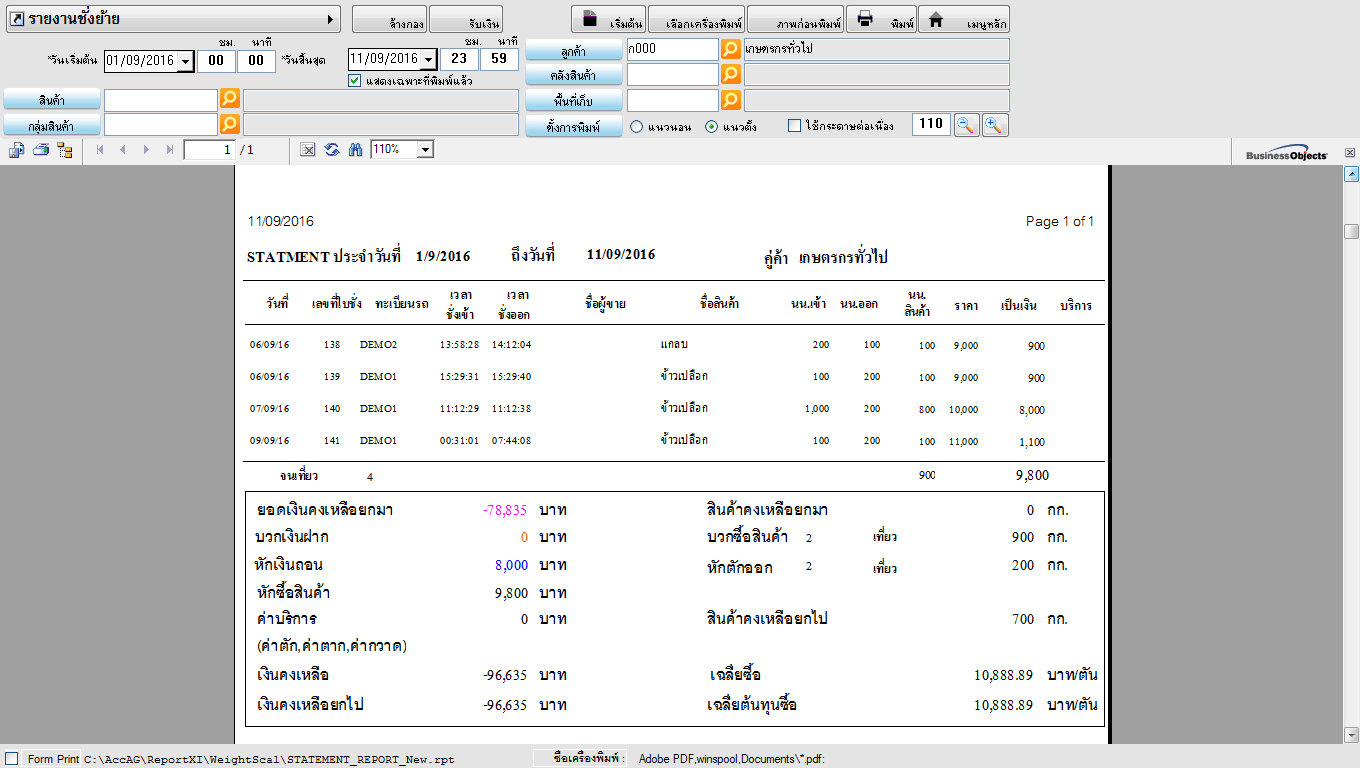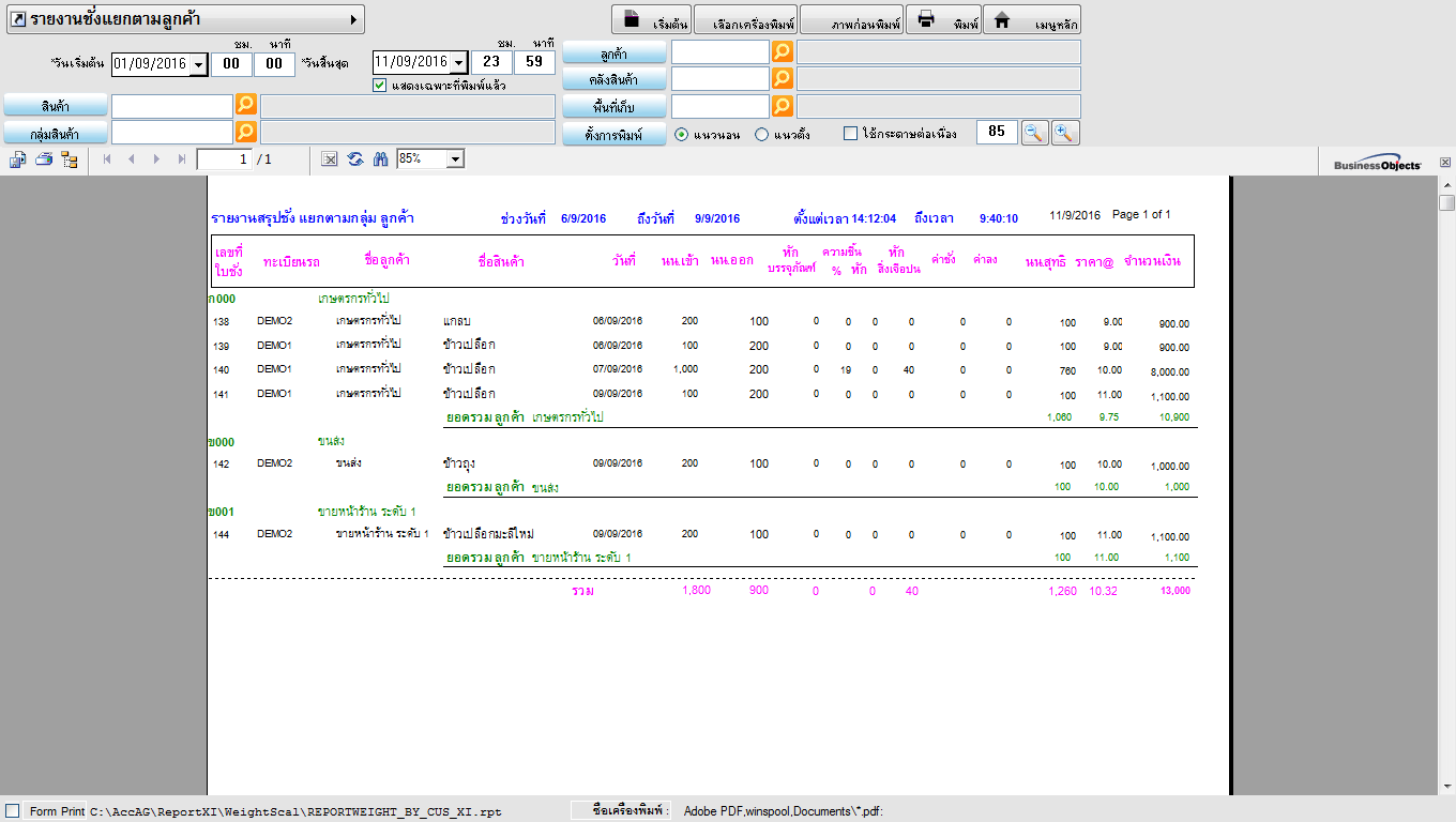 รายงานสรุปชั่งแยกตามลูกค้า สินค้า และวันที่ เวลา
