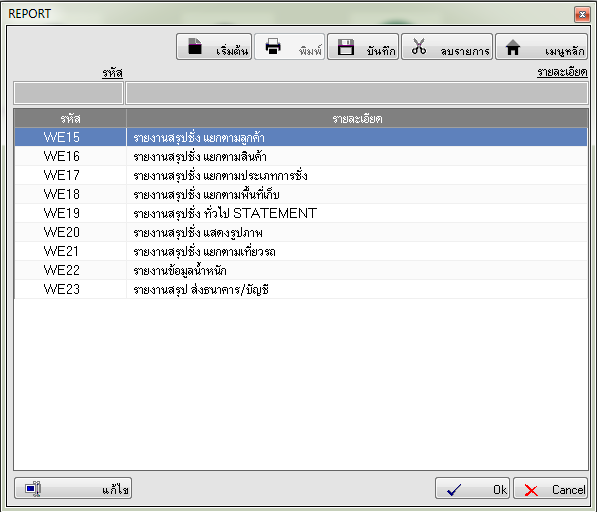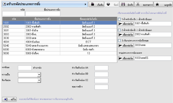 ประเภทการชั่ง ใช้สำหรับเลือกแบบฟอร์มการพิมพ์ ตามที่เราได้ออกแบบไว้.สามารถออกแบบได้ถึง 10 แบบฟอร์ม ในแต่ละประเภทสามารถกำหนดตารางความชื้นแยกได้ หากเราแยกประเภทในการชั่ง รายงานที่สรุปออกมาจะแยกตามประเภทการชั่งด้วยเช่นกัน